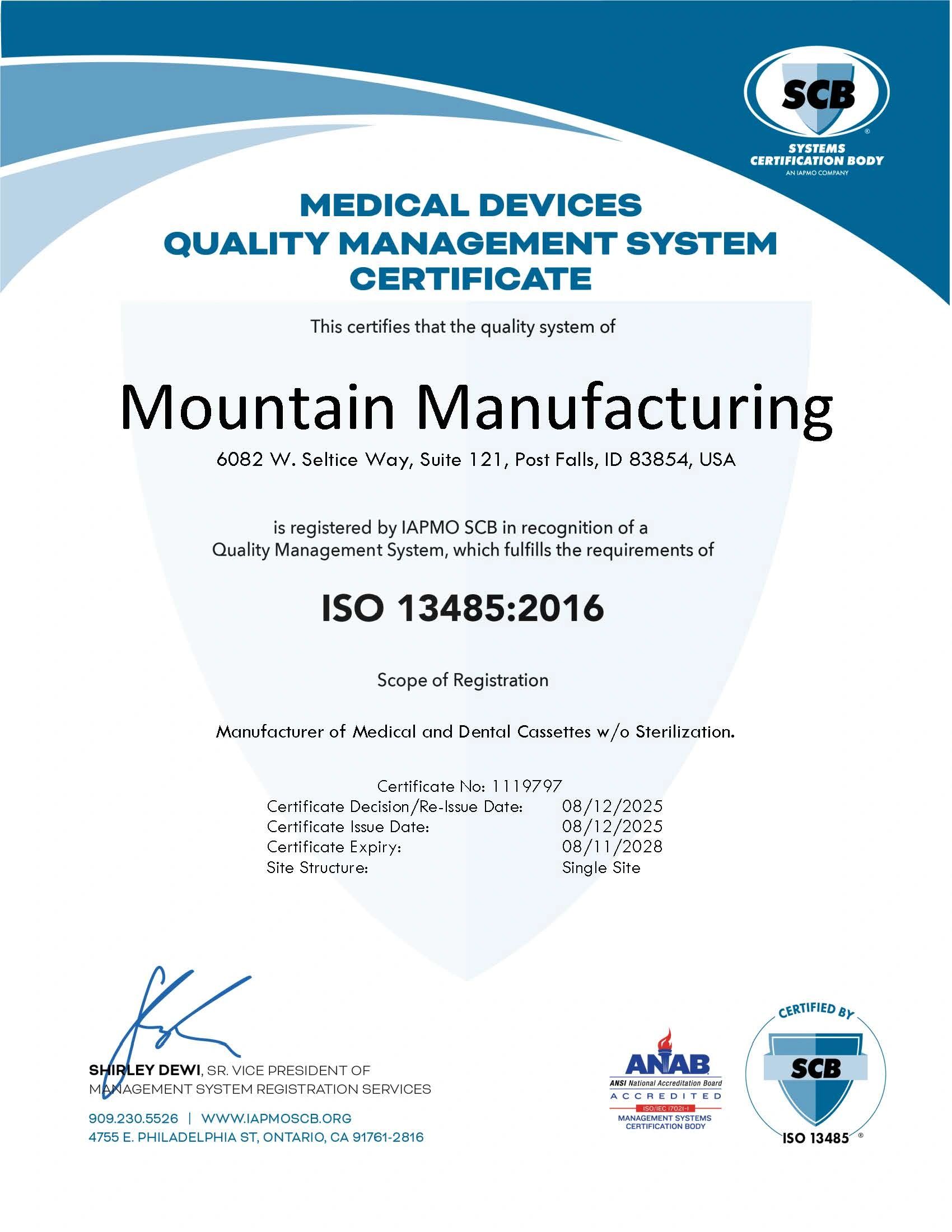 Mountain Manufacturing is currently ISO 13485 Medical Device certified.